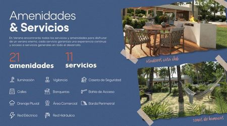 En Verana encontrarás todos los servicios y amenidades para disfrutar de un verano eterno, cada servicio garantiza una experiencia continúa y acceso a servicios generales en todo el desarrollo.