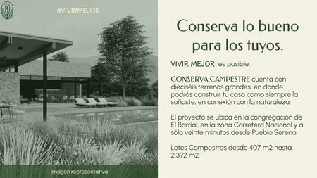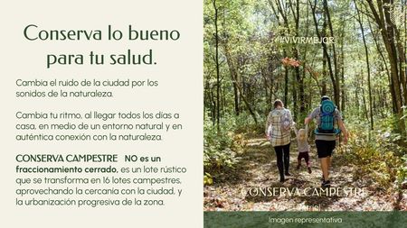 Terrenos Campestres en venta Fraccionamiento CONSERVA CAMPESTRE es un proyecto que propone un nuevo estilo de vida, en donde se recupera la conexión de las personas con la naturaleza.