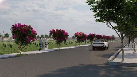 Calle pavimentada perimetral, banquetas, postes de luz, arbolado y libre de cuotas de mantenimiento. Periferia bardeada.