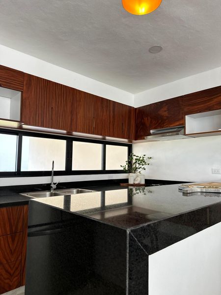 - Cocina con meseta de granito, carpintería de madera tzalam y campana.
