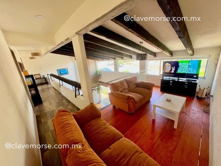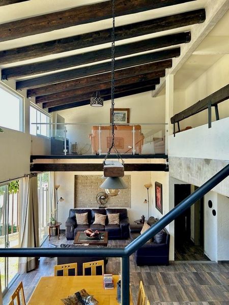 Un hermoso tapanco de madera funciona como sala de TV, con vista hacia la sala principal.
