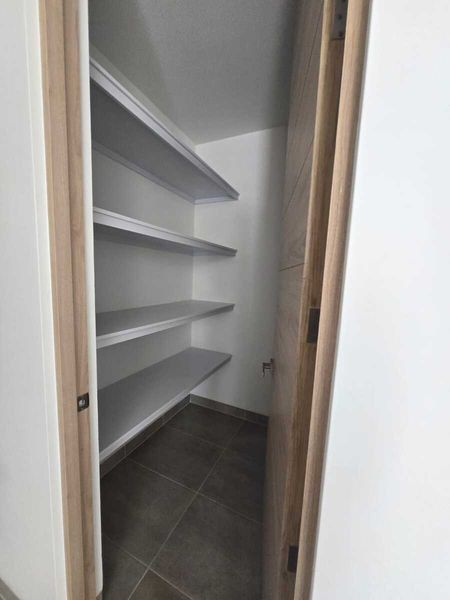 Cocina abierta con barra central y amplia alacena independiente