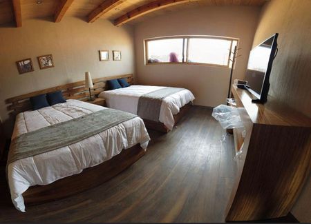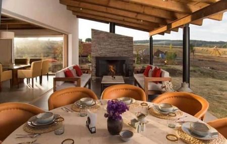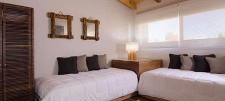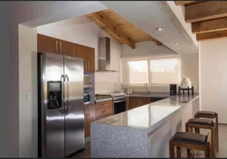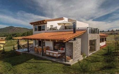 Construida en un terreno de 2450 metros, la casa cuenta en planta baja con 3 recamaras, todas con TV, baño completo. Cocina integral, sala, comedor, chimenea. Terraza con chimenea de leña, jacuzzi con camastros. En planta Alta cuenta con habitacion con tv y baño completo.