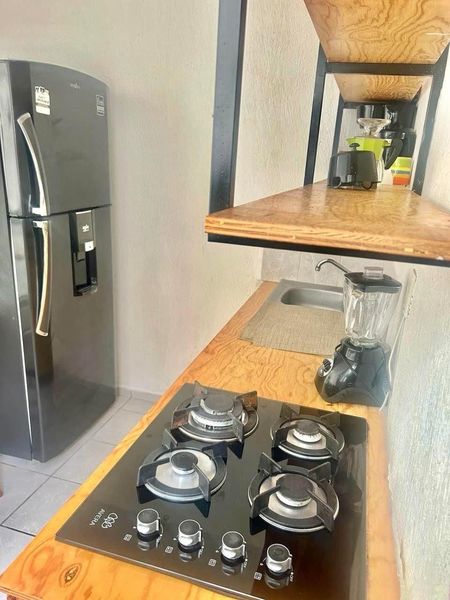 Cocina con parrilla de 4 quemadores y refrigerador