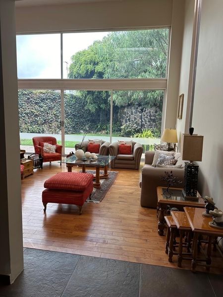 Pasando se encuentra la amplia e iluminada estancia, sala con chimenea, comedor con acceso directo a cocina. Techo doble altura con grandes ventanales a todo lo largo y ancho, abiertos dan salida directa al jardín trasero.