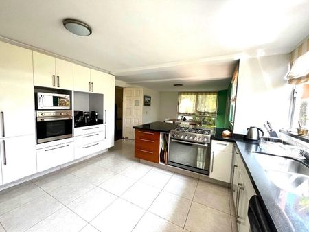 La cocina amplia es integral en forma de “L” con lavavajillas y un mueble empotrado para alacena o despensa y área para ante comedor con vista al jardín delantero.