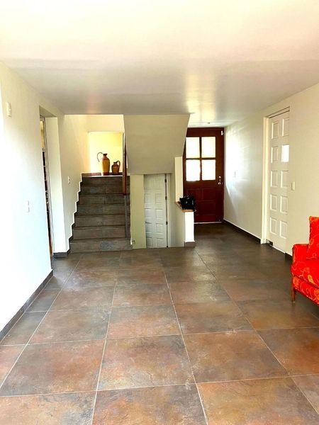 Entrando se encuentra un ancho vestíbulo con acceso directo a la cocina y con closet para visitas, un medio baño a desnivel y un pequeño clóset, aprovechando espacio bajo las escaleras.