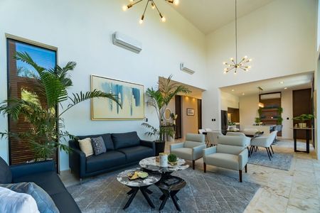 Sala y comedor a doble altura con vista al jardín y piscina