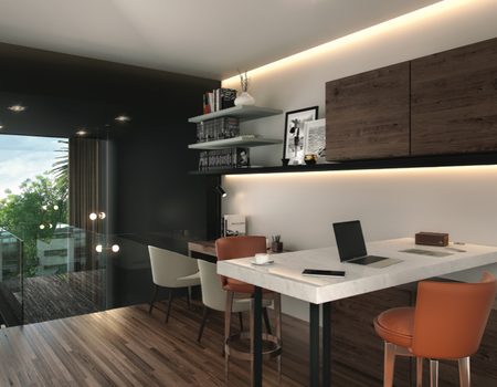 Subiendo al segundo nivel se encuentra un estudio que por su diseño y distribución ofrece un lugar ideal para trabajo o tareas el cual está también privilegiado de luz natural. Este espacio funge como antesala de una recámara completa y funcional que dará descanso y comodidad.