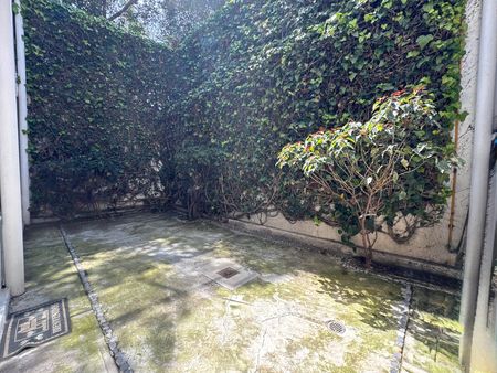 Cocina integral cerrada con alacena y patio privado con pared verde