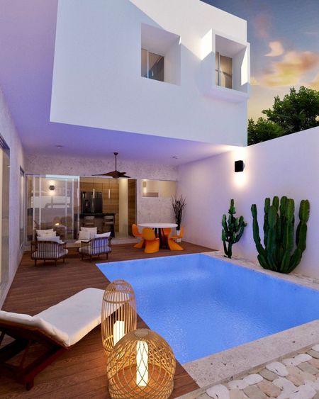 Piscina con acabado en chukum y luz de colores