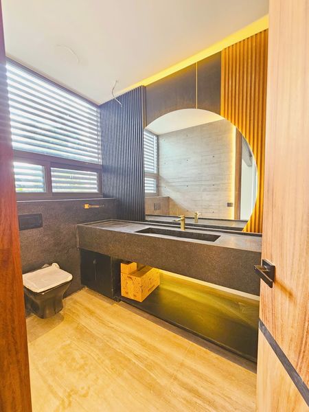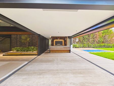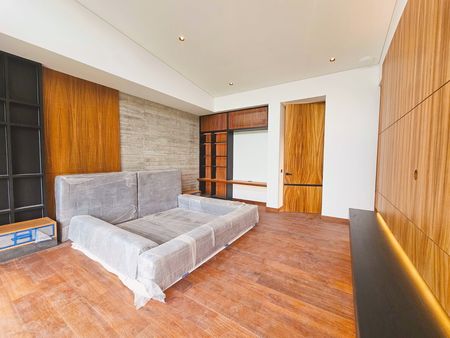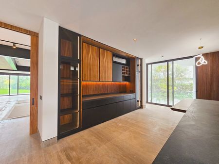 - Recámara principal con baño completo, clóset vestidor amplio, muros revestidos en parota, aire acondicionado, y carpintería a medida