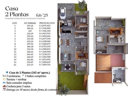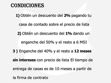 3 ) Enganche del 40% y el resto a 12 meses sin intereses con precio de lista El tiempo de entrega de casas es de 10 meses a partir de la firma de contrato