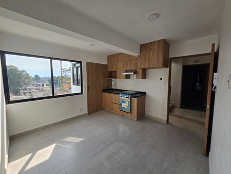 Estrena departamento de 50 m2. Cuenta con dos recámaras con closets, cocina integral con barra de granito, baño completo, pisos de porcelanato, área de lavado, estacionamiento para un auto, roof garden común con asador y horno de leña.