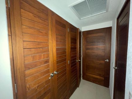 Pasillo distribuidor a recámaras con closets de blancos.