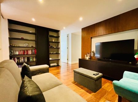 Amplio departamento, 250 m2 distribuidos en una amplia área social con vista arbolada, cocina integral con barra, family room, medio baño de visitas, tres amplias recámaras, principal con doble vestidor, baño regadera y tina, secundarias con clóset y baño. Cuarto de servicio y área de lavado. Tres lugares de estacionamiento y bodega.