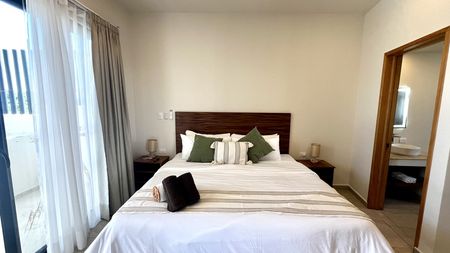 Santal Tulum ofrece departamento en venta en tercer piso con elevador, interior con vista a la piscina y wifi incluido. Cuenta con una distribución de espacios con 142m2 y una bella decoración , tiene aire acondicionado, cama king con balcón y acceso a la piscina en habitación principal y baño completo privado , cocina totalmente equipada con minibar, microondas y cafetera, sala y comedor con Smart TV y medio baño, lockoff para segunda habitación que puede ser estudio independiente o segunda habitacion, con cama king con balcón, cocina equipada y baño completo.