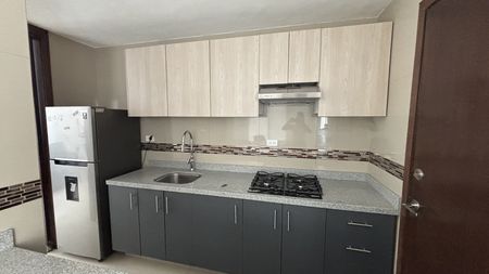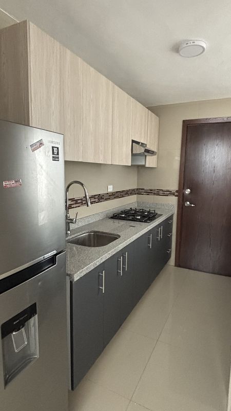Cocina integral equipada con refrigerador, estufa, campana