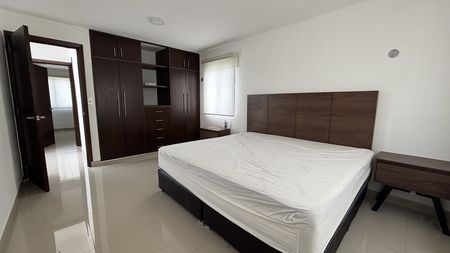 Recámara principal con closet de pared vestido persianas y aire acondicionado nuevo con juego de cama king size y burós