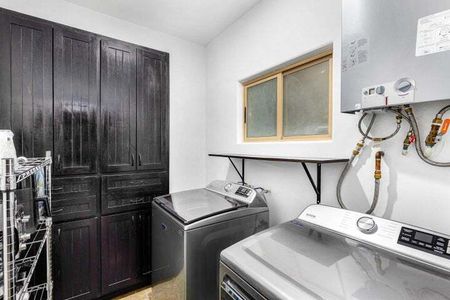 Electrodomésticos nuevos en cocina y lavandería: lavadora, secadora de gas, horno, microondas y refrigerador con fábrica de hielo