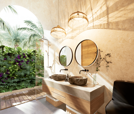 Características de terminados: lavabos de piedra, barra de cocina de cemento pulido, paredes de