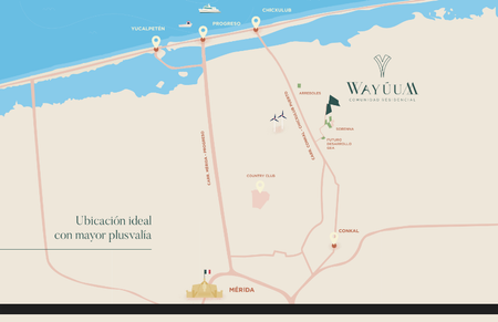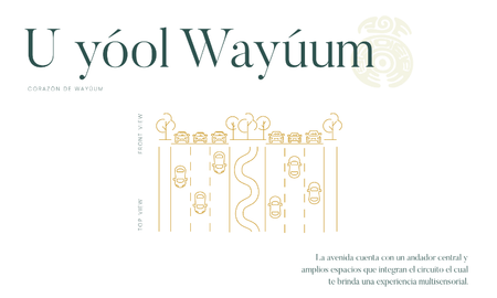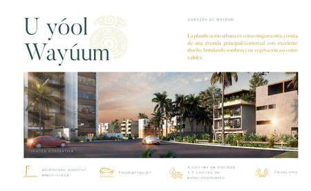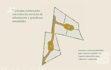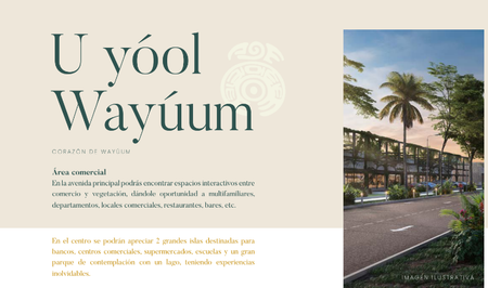 La mejor comunidad planeada, ya que está pensada en un estilo de vida único, la cual contará con todos los servicios de urbanización para habitar. El corazón de WAYÚUM comprende desde la avenida comercial con todos los servicios de : agua, alumbrado público y pavimentación hasta un gran área comercial con espacios interactivos entre comercio y vegetación.