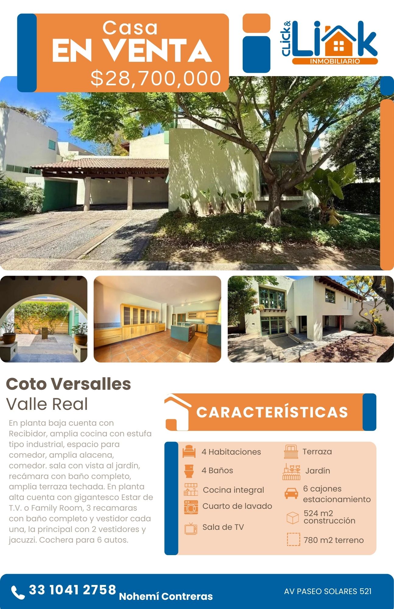Nohemí ContrerasEn planta baja cuenta con Recibidor, amplia cocina con estufa tipo industrial, espacio para comedor, amplia alacena, comedor. sala con vista al jardín, recámara con baño completo, amplia terraza techada. En planta alta cuenta con gigantesco Estar de T.V. o Family Room, 3 recamaras con baño completo y vestidor cada una, la principal con 2 vestidores y jacuzzi. Cochera para 6 autos.