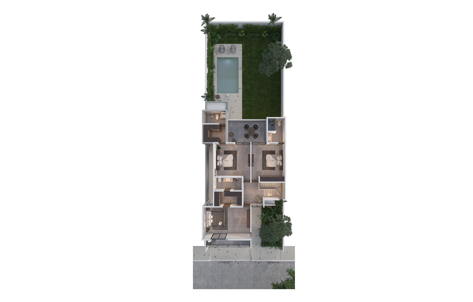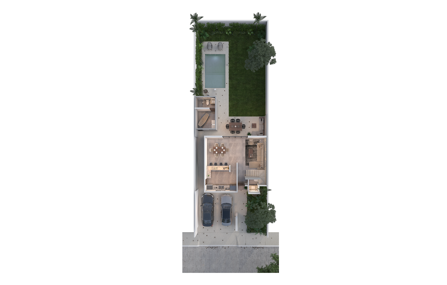 Model Residence 243 m2 in Temozón Norte, residential private area with 75 houses of 3 and 4 bedrooms. This model offers spacious areas distributed over 2 floors, with terraces, pool, and service room.