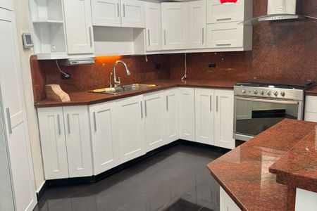 Cocina equipada con gavetas, barra de servicio, parrilla eléctrica de 4 quemadores y utensilios de cocina