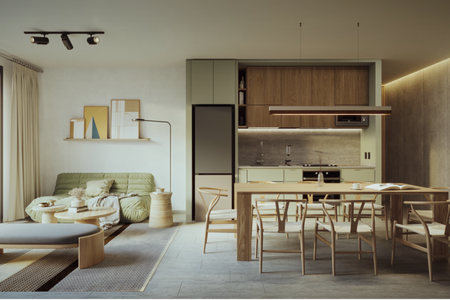 Recibidor amplia área social, doble sala, comedor, salida directa a terraza. Cocina completamente equipada, cubierta de cuarzo, isla central y concepto abierto hacia el area social. Baño de visitas.