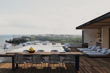 Amenidades: alberca con vista al mar, gym, coworking, asador, bar, fire pit, asoleadero, club de playa.